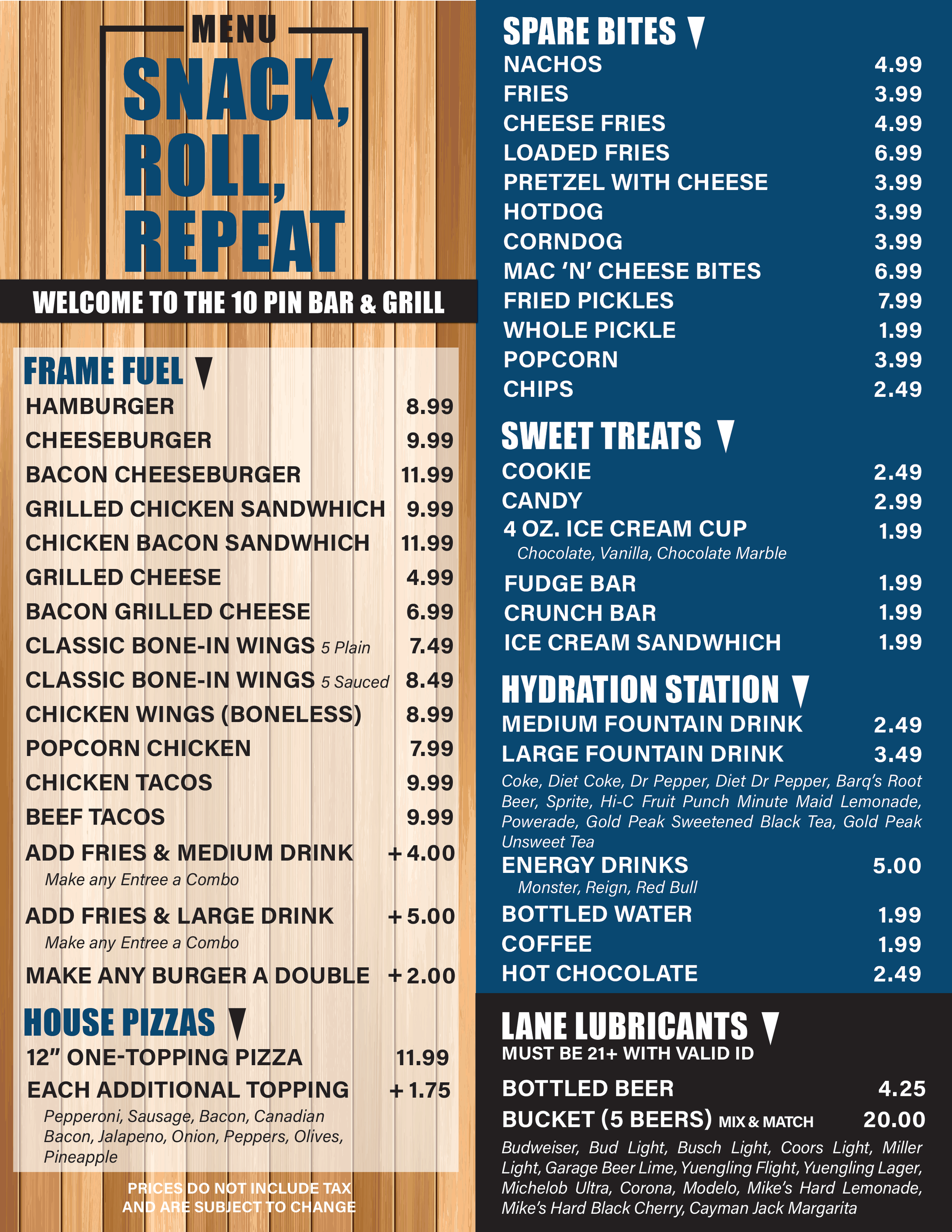 10 pin bar & Grill OUR MENU OPEN FOR LUNCHNo bowling necessaryserving at 11 am monday through friday View fullsize